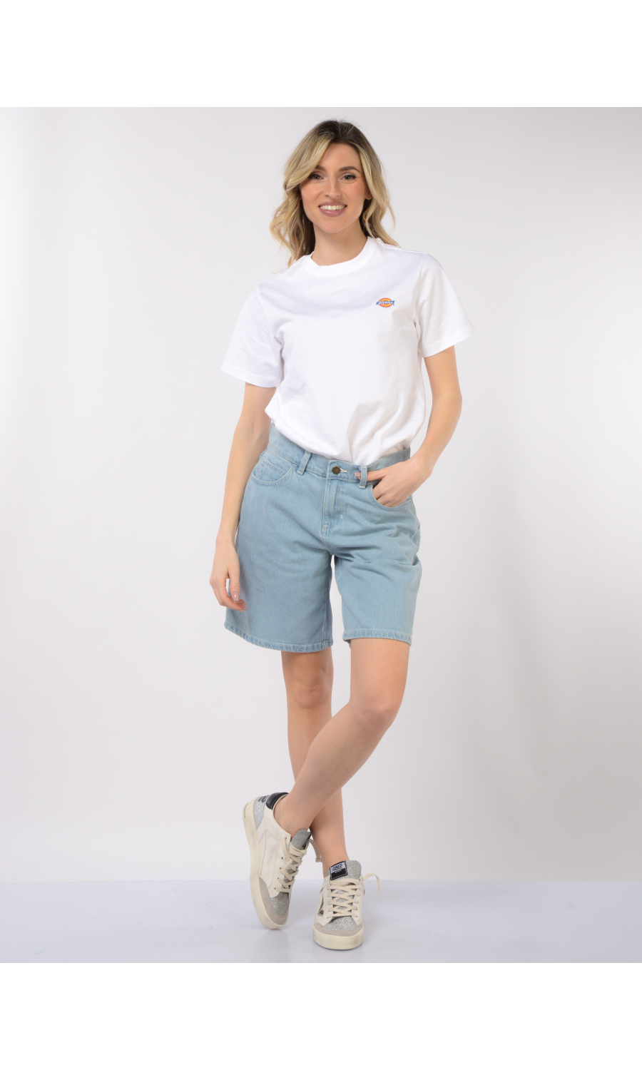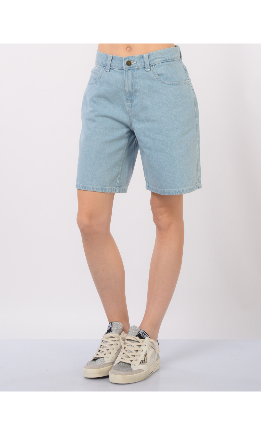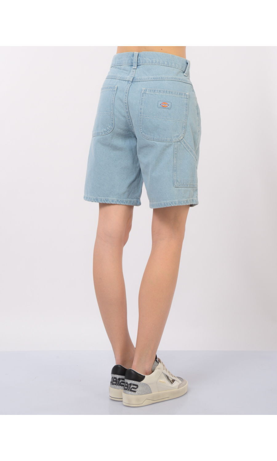 Bermuda modello Herndon in denim delave', chiusura frontale con bottone logato in metallo brunito a vista e zip nascosta, fascetta in vita con passanti, cinque tasche, logo in tessuto applicato sul retro.