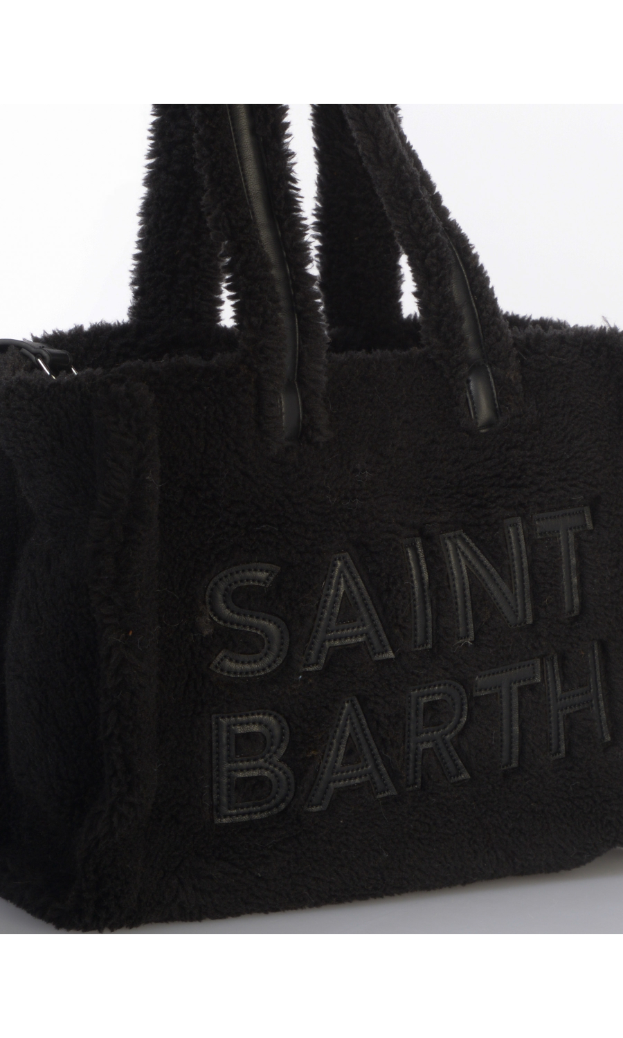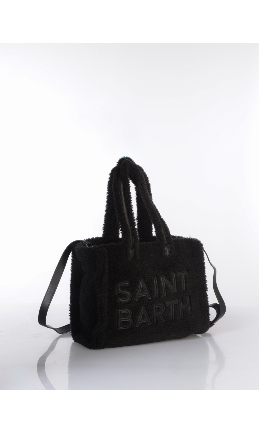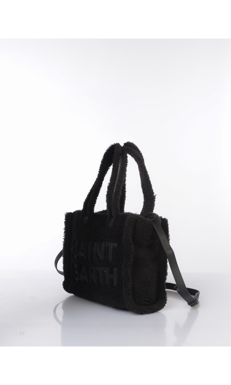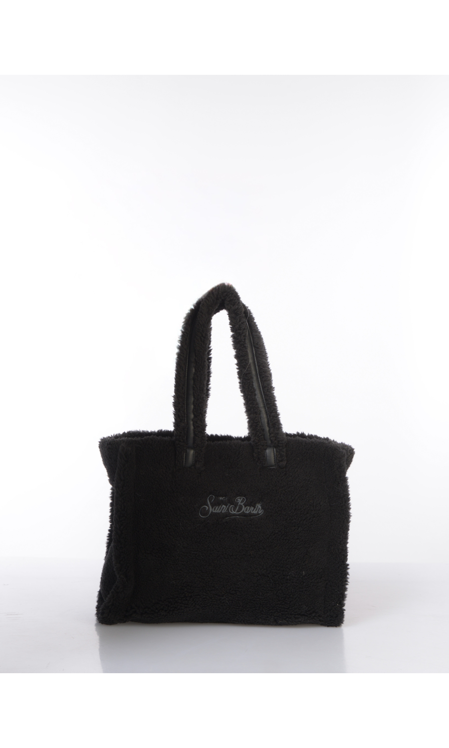 Borsa a mano modello Medium in tessuto effetto teddy, due manici fissi e tracolla regolabile in similpelle effetto camoscio in tinta unita, logo in similpelle in tono colore applicato frontale e ricamato posteriore a contrasto colore, chiusura con bottone a pressione a vista, uno scomparto, una tasca di servizio interna chiusa con zip, foderata con fodera in tessuto.