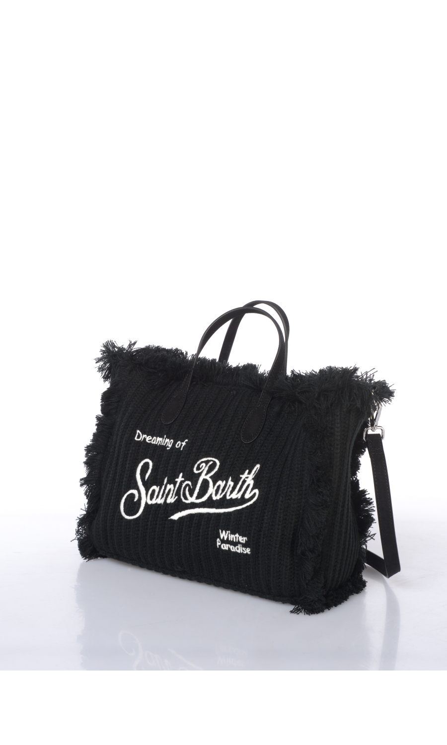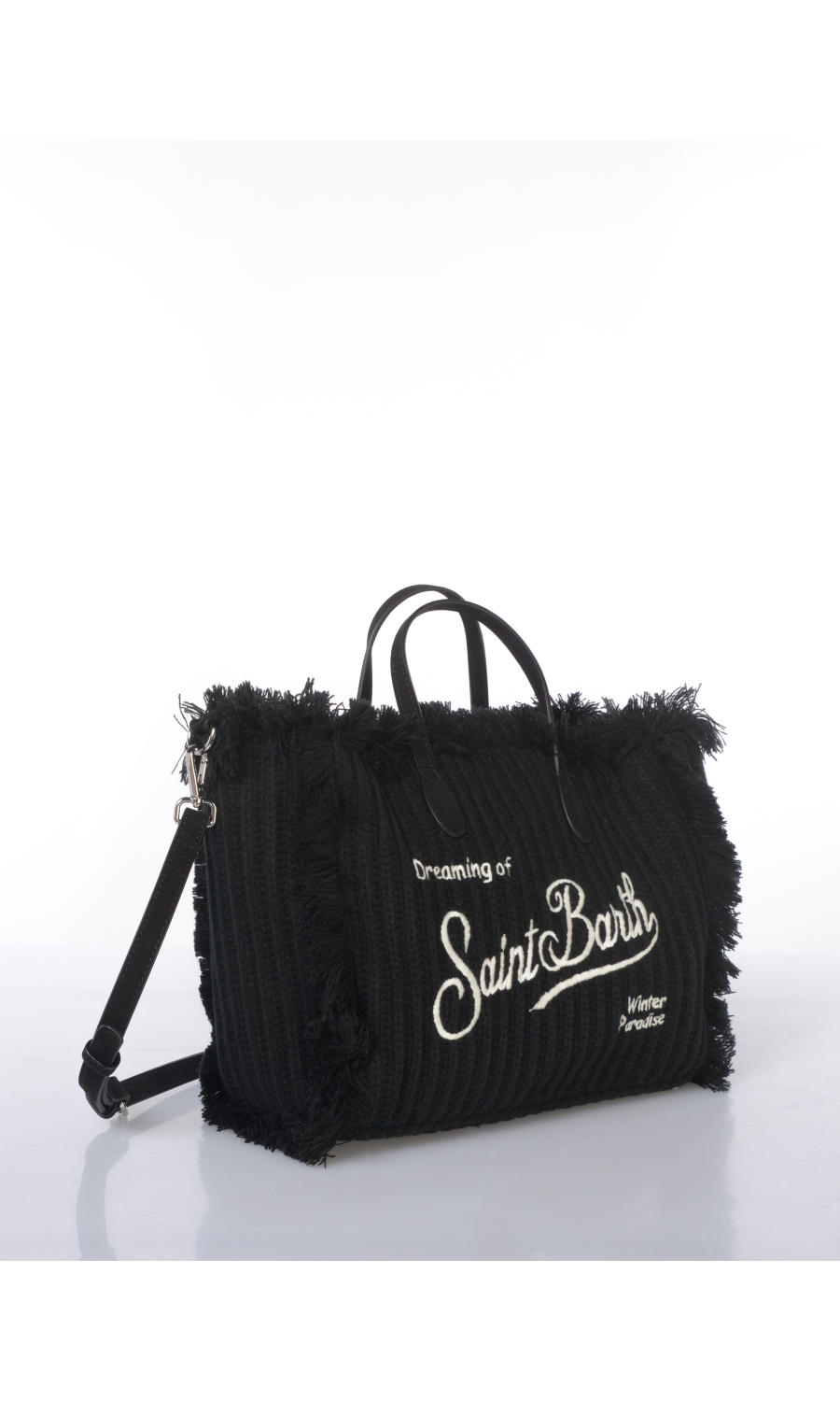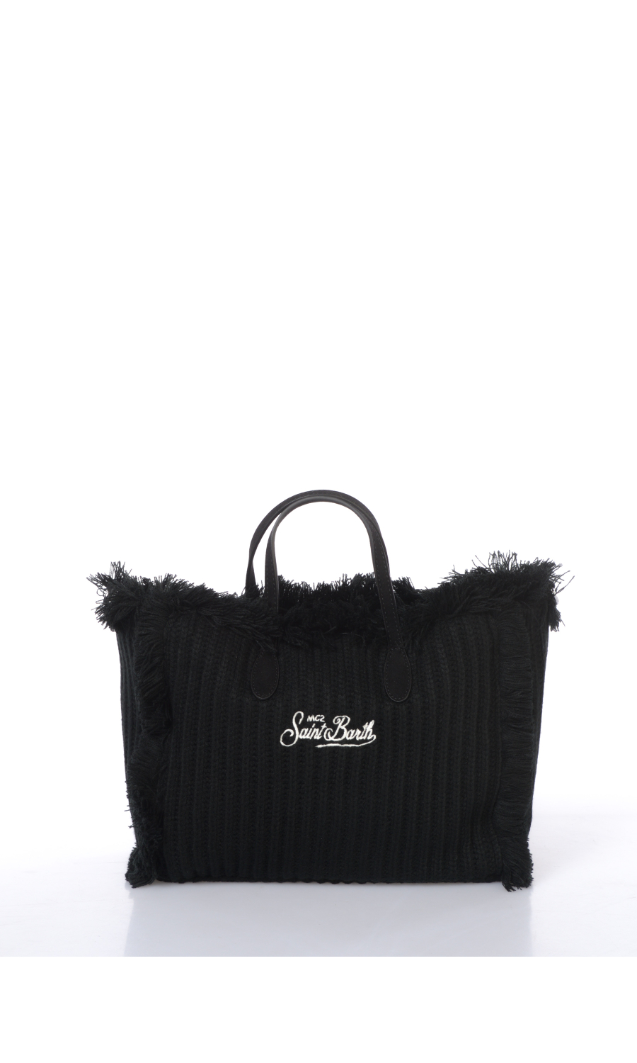 Borsa a mano modello Medium in tessuto effetto maglia a coste con logo ricamato frontale e posteriore a contrasto colore, due manici fissi in similpelle in tono colore, tracolla regolabile in similpelle completamente rimovibile, piedini in metallo applicati sul fondo, applicazione di frange ai lati in tono colore, chiusura con zip, uno scomparto, due tasche di servizio interne di cui una chiusa con zip, foderata con fodera in velluto in tono colore.