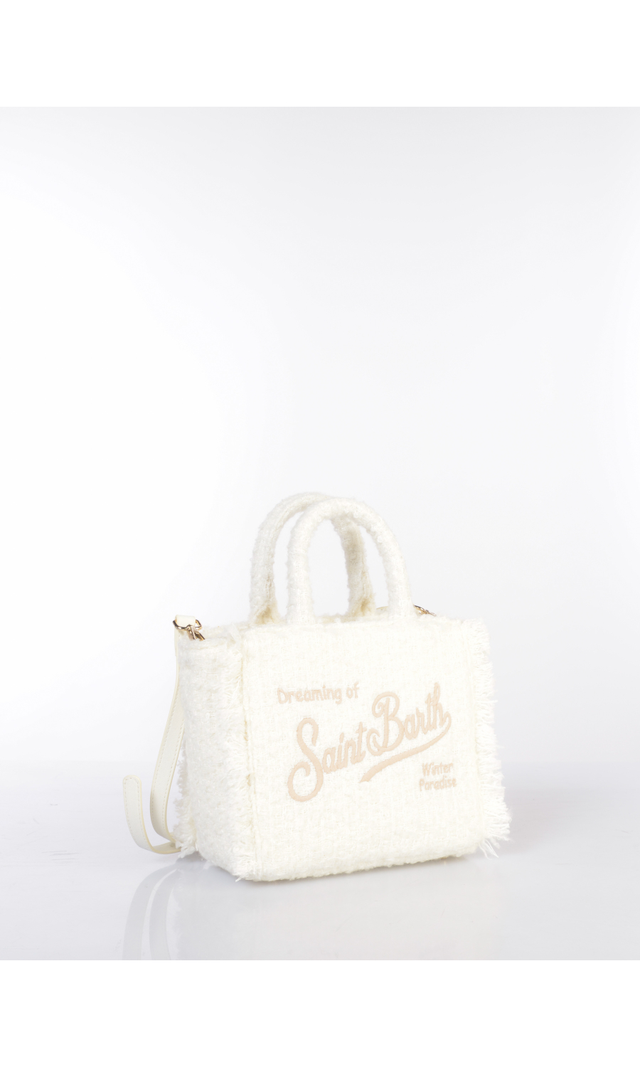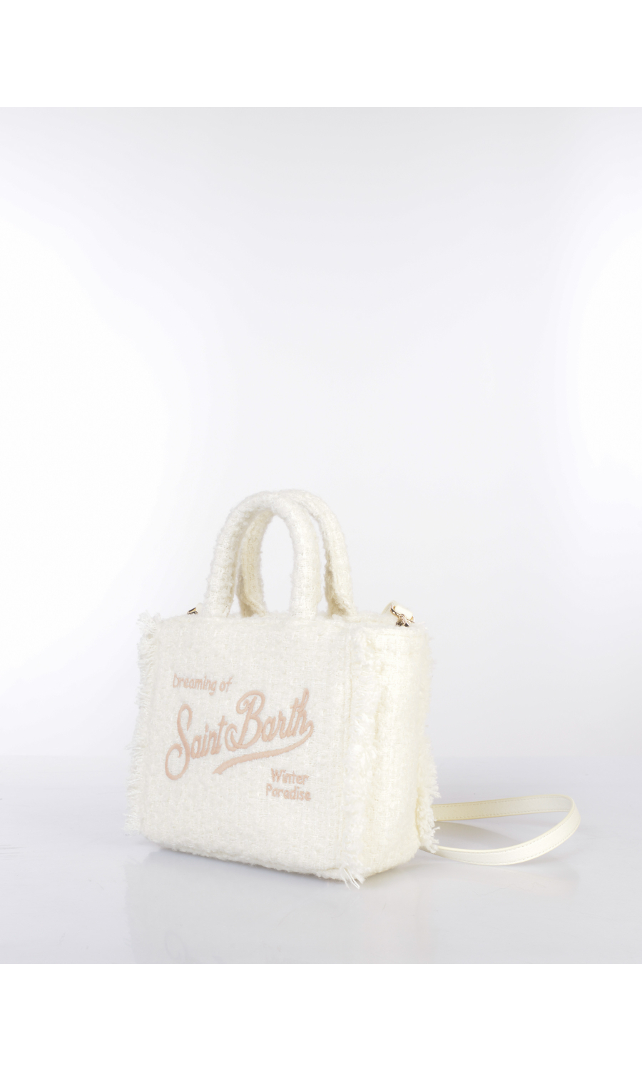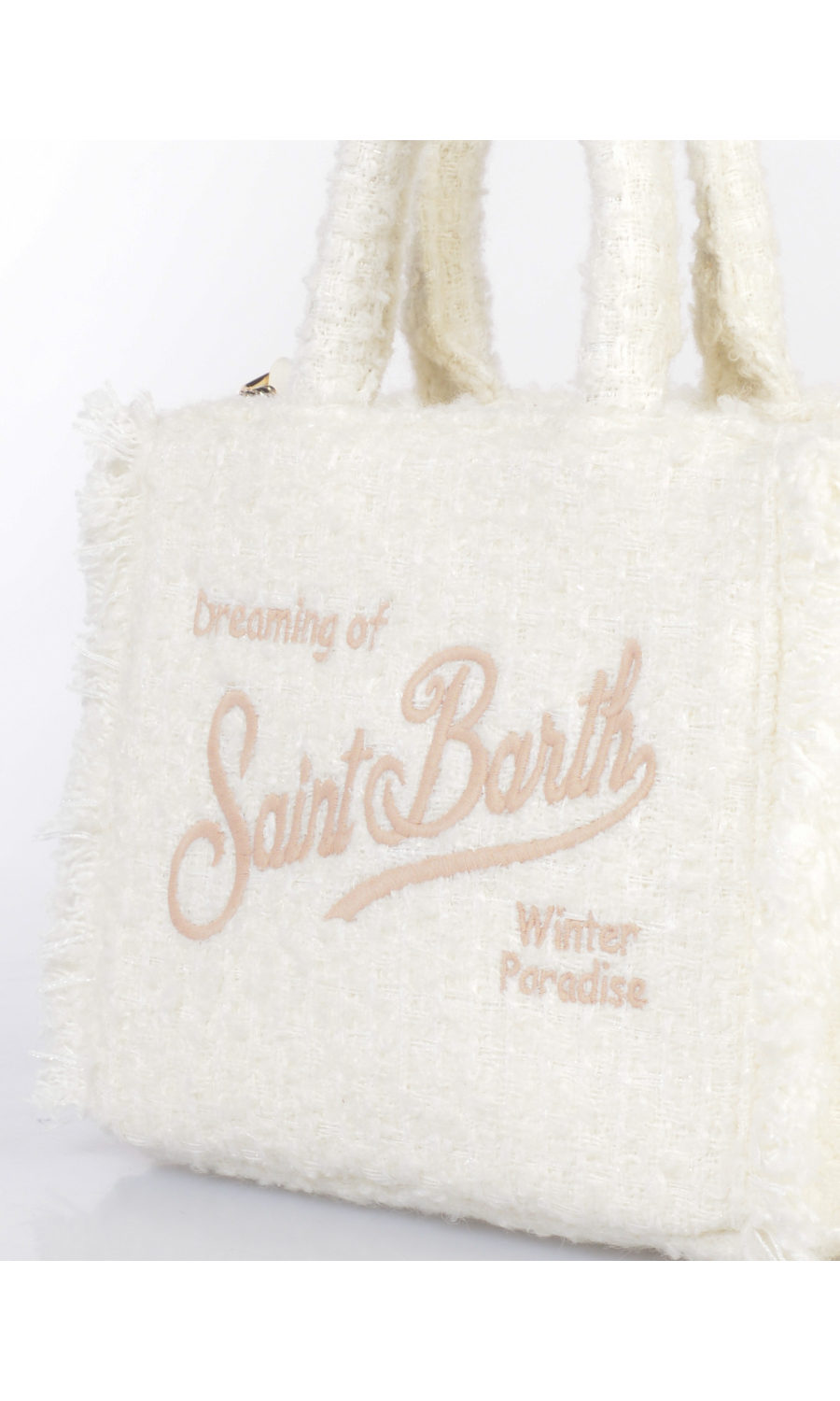 Borsa a mano modello Mini in tessuto effetto tweed con inserimento di fili lurex, due manici fissi e tracolla regolabile in similpelle effetto camoscio in tono colore, logo ricamato frontale e posteriore a contrasto colore, applicazione di frange ai lati, piedini in metallo applicati sul fondo, chiusura con zip, uno scomparto, due tasche di servizio interne di cui una chiusa con zip, foderata con fodera effetto velluto in tono colore.