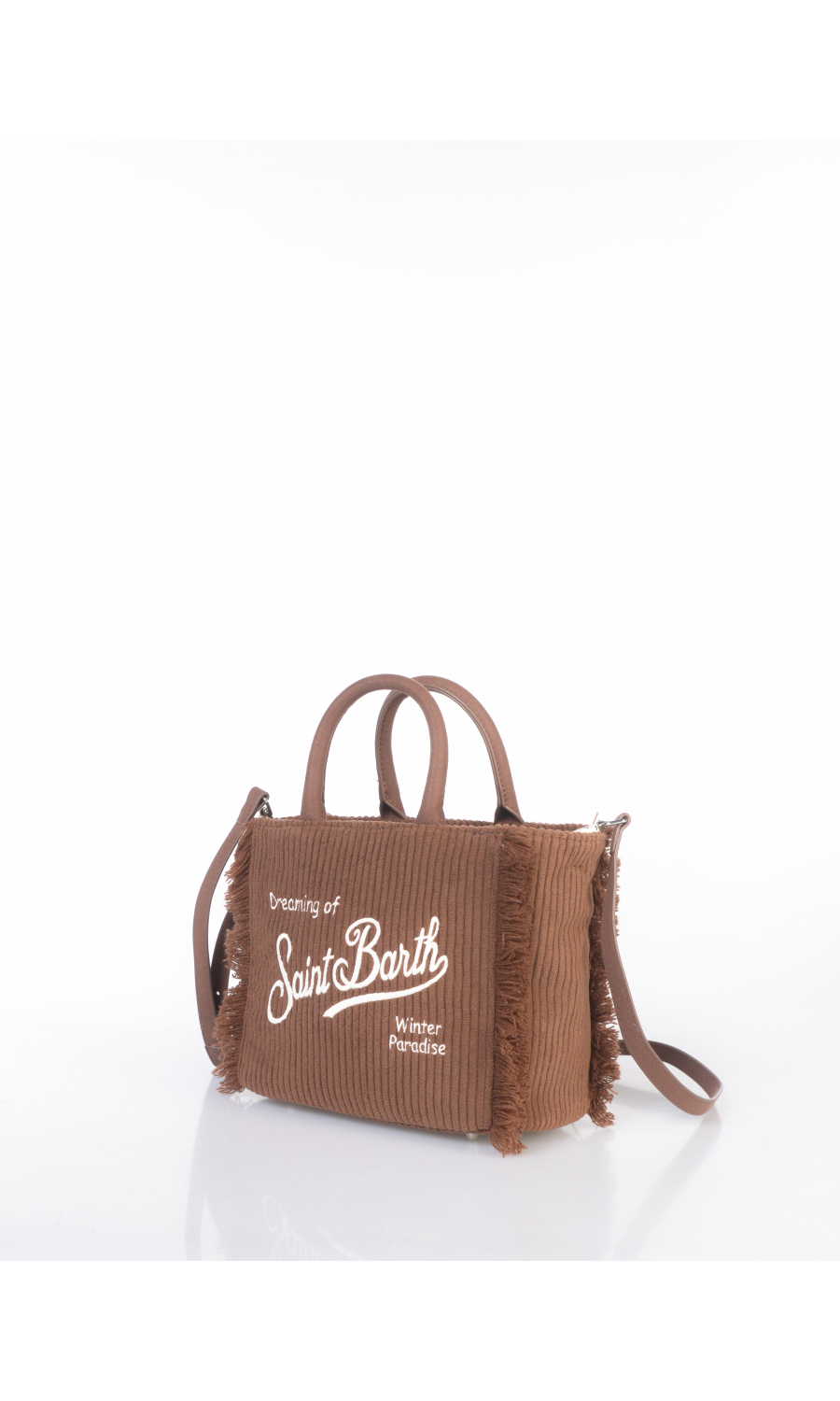 Borsa a mano modello Mini in tessuto effetto velluto rigato, due manici fissi e tracolla regolabile in similpelle effetto camoscio in tono colore compresa e completamente rimovibile, logo ricamato frontale e posteriore a contrasto colore, applicazione di frange ai lati, piedini in metallo applicati sul fondo, chiusura con zip, uno scomparto, due tasche di servizio interne di cui una chiusa con zip, foderata con fodera effetto velluto in tono colore.
