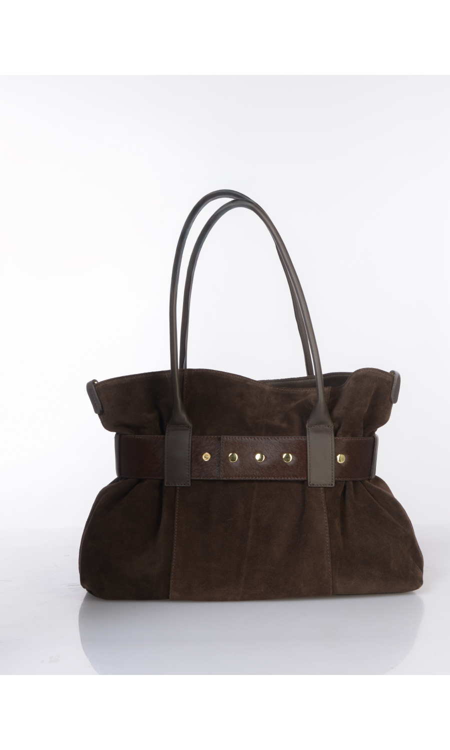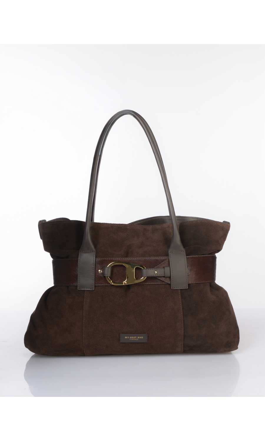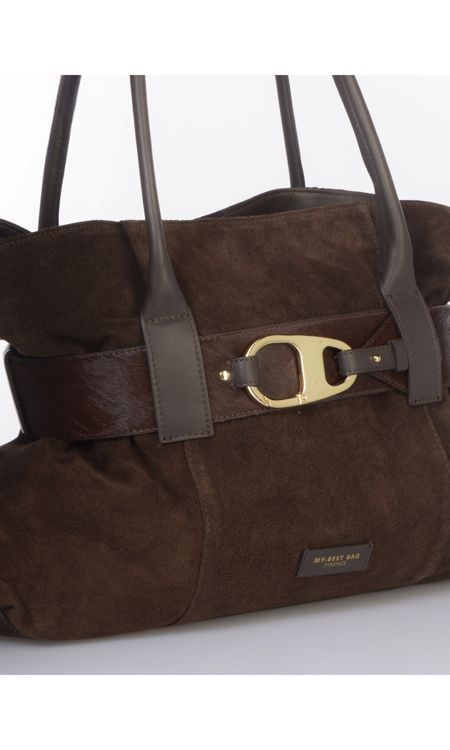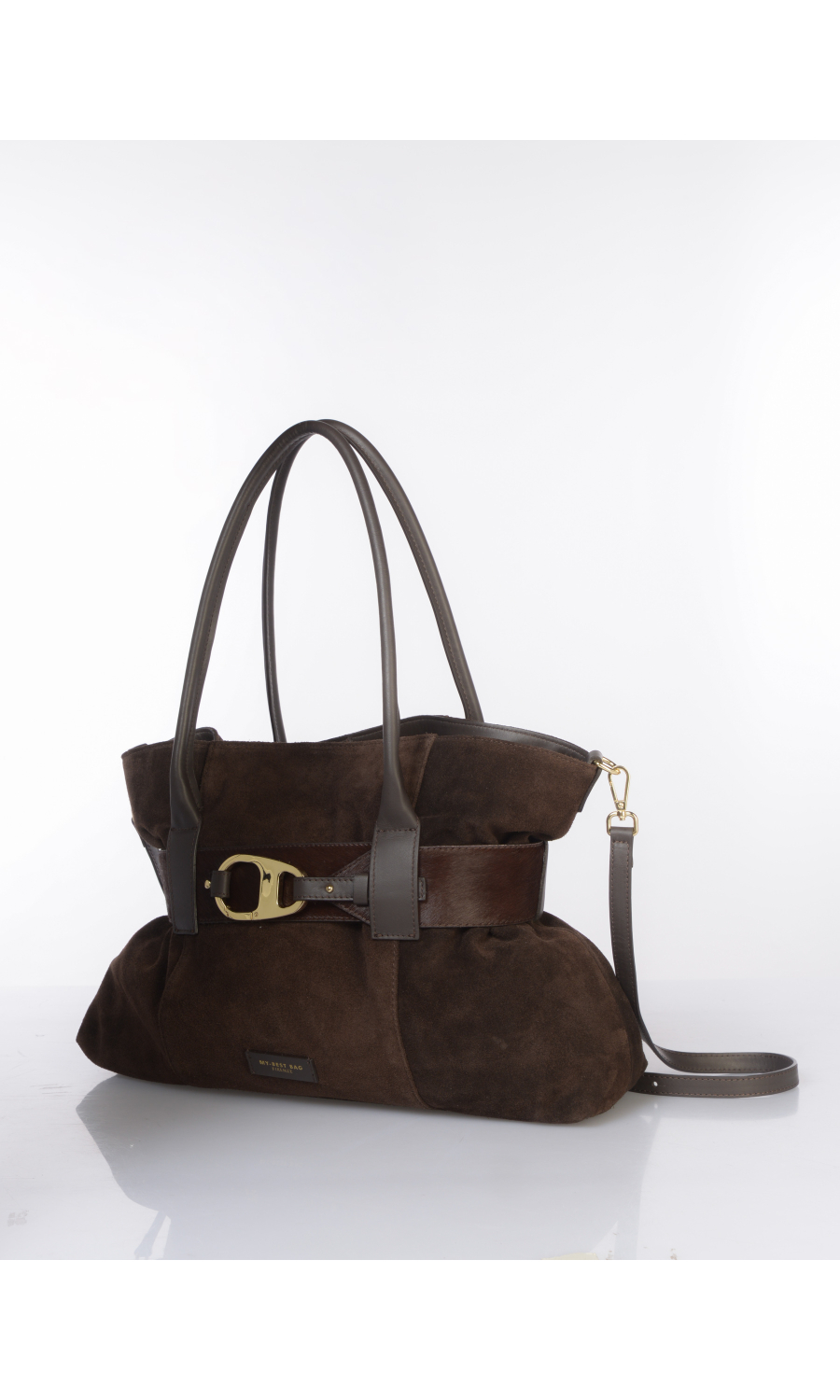 Borsa a mano in vera pelle effetto camoscio con cintura effetto cavallino chiusa con moschettone logato in metallo dorato compresa e completamente rimovibile, due manici fissi e tracolla regolabile nello stesso materiale completamente rimovibile, logo applicato frontale, chiusura con bottone a pressione, uno scomparto, una tasca di servizio interna chiusa con zip, foderata con fodera in tessuto a contrasto colore.