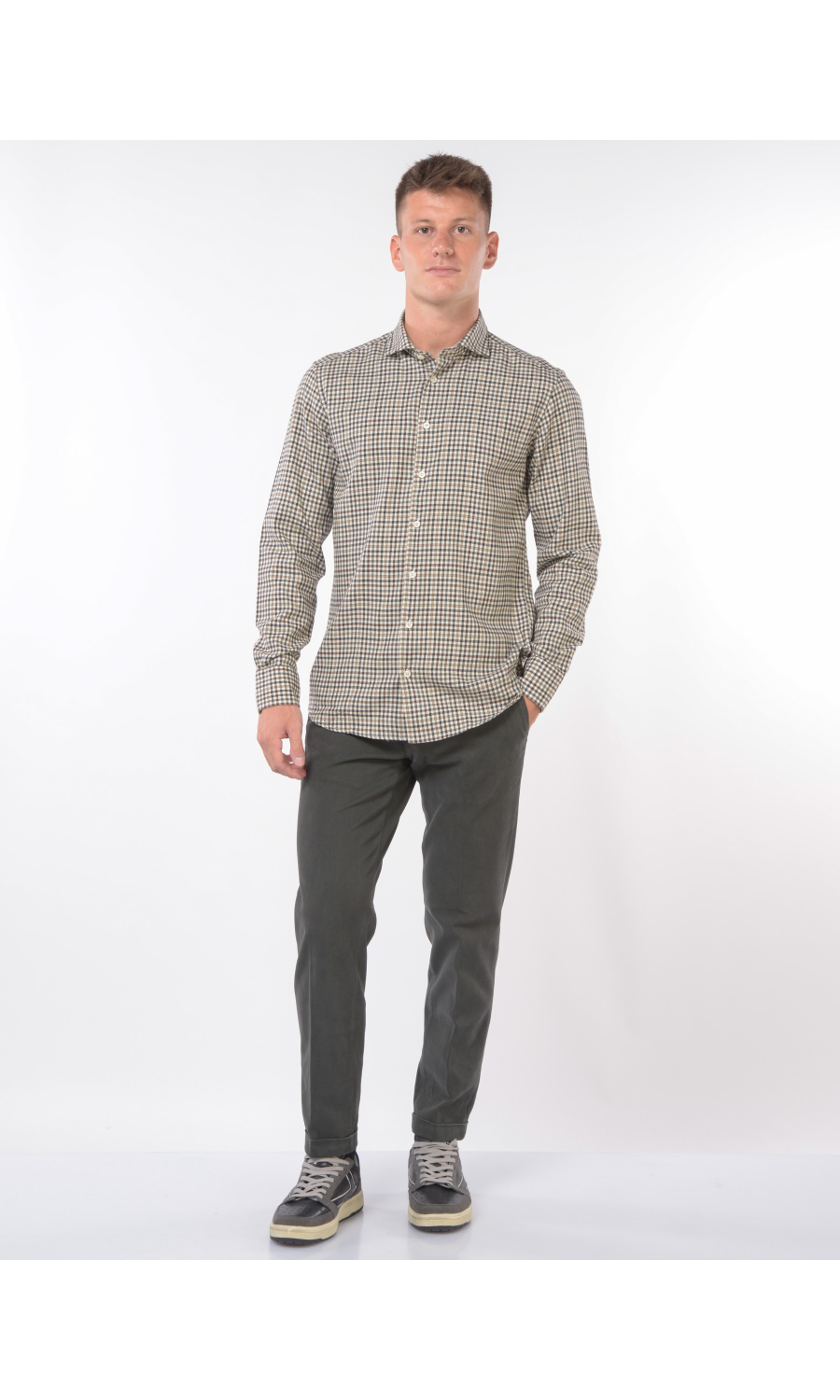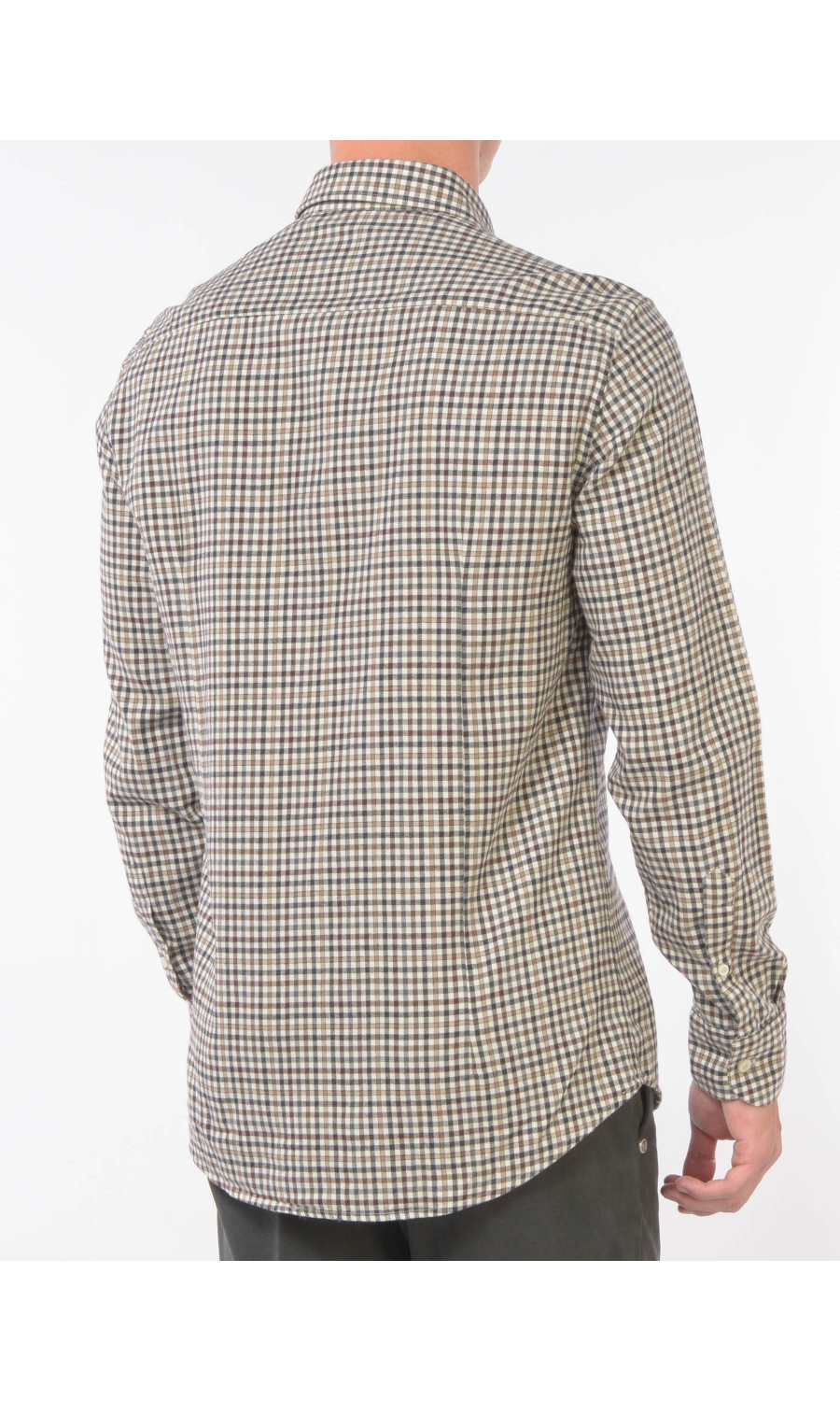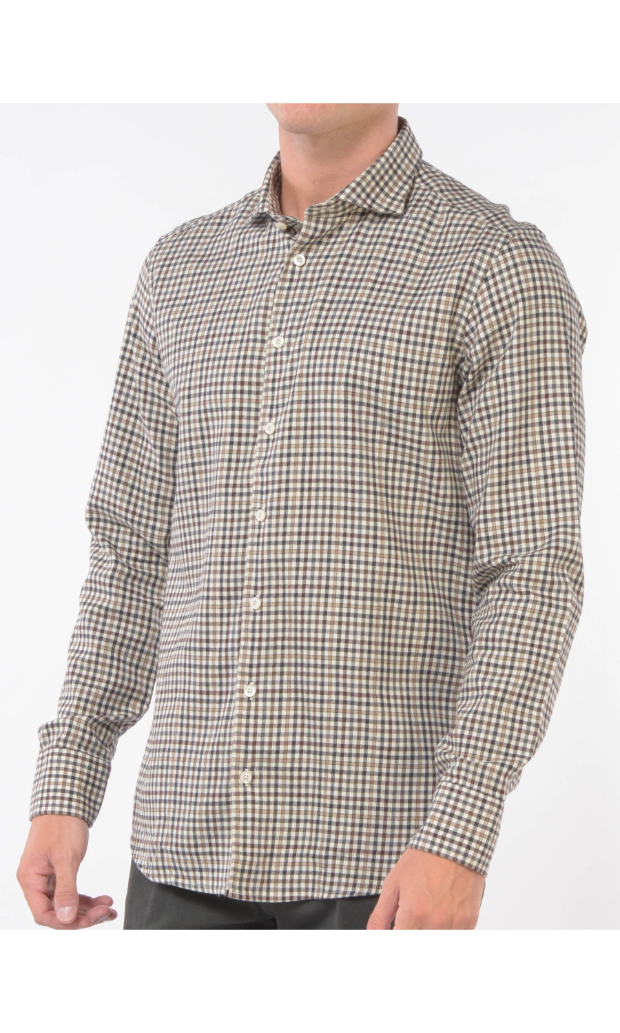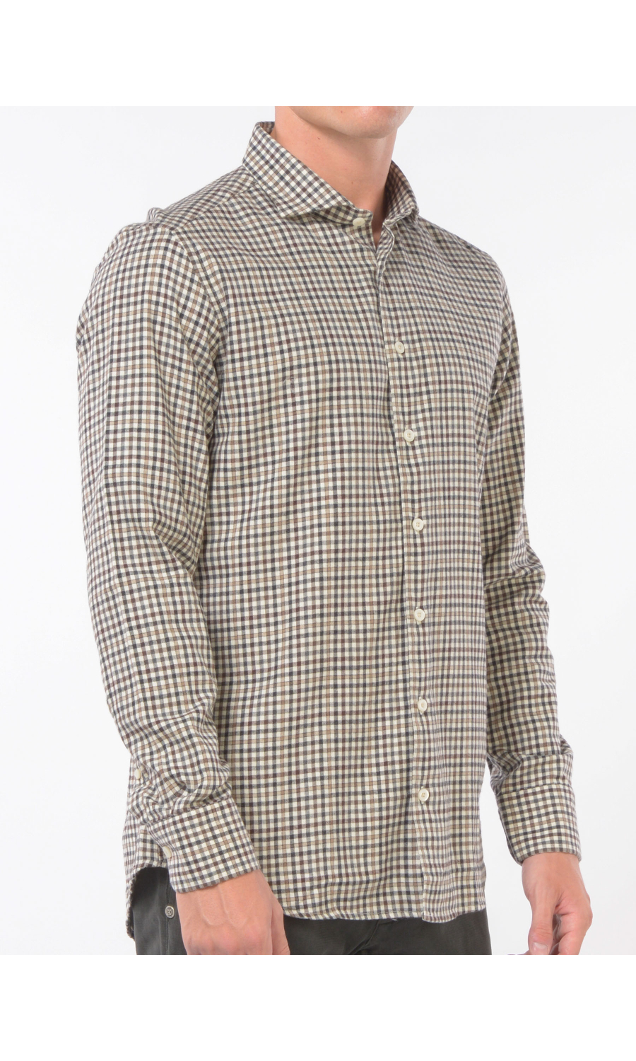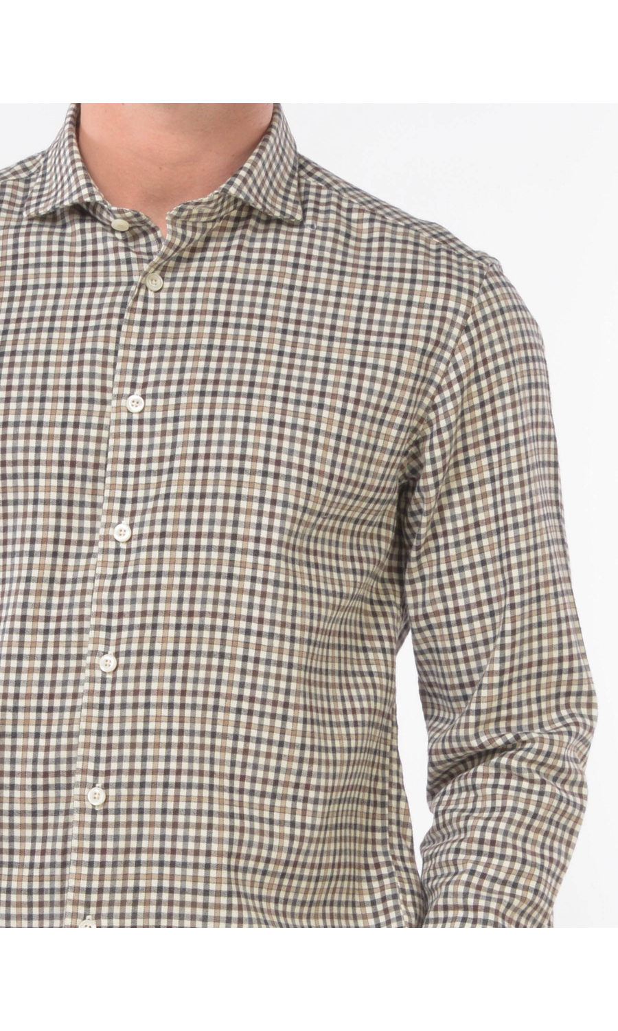 Camicia in fantasia micro quadro a contrasto colore con collo francese morbido, chiusura frontale con bottoni a vista, manica lunga con polso, carre sul retro, fondo stondato, cotone flanellato