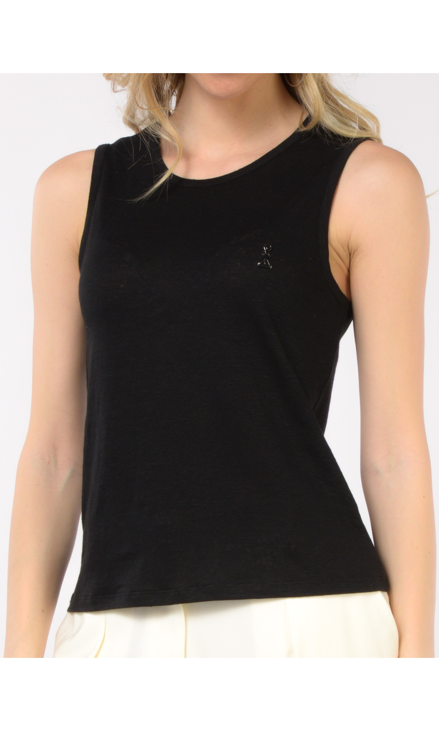 Canotta in lino con logo Fly in metallo dorato applicato frontale e ricamato in tono colore sul retro, ampio giromanica, medio grado di trasparenza.