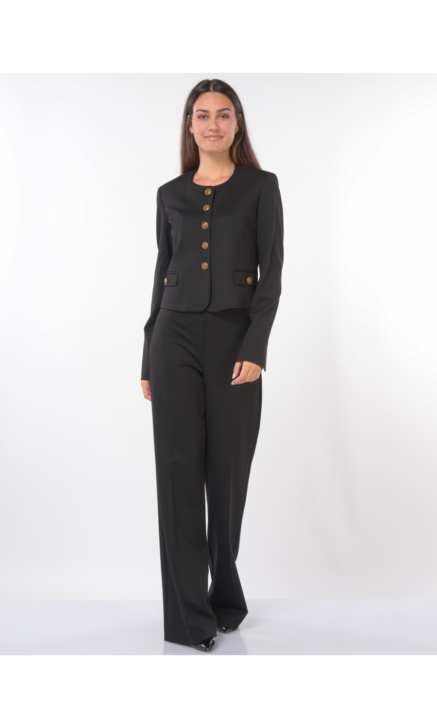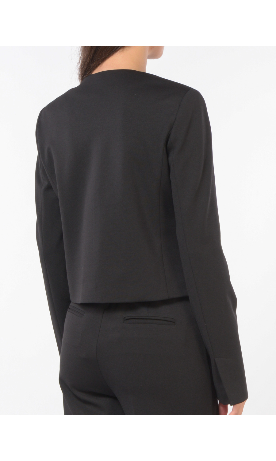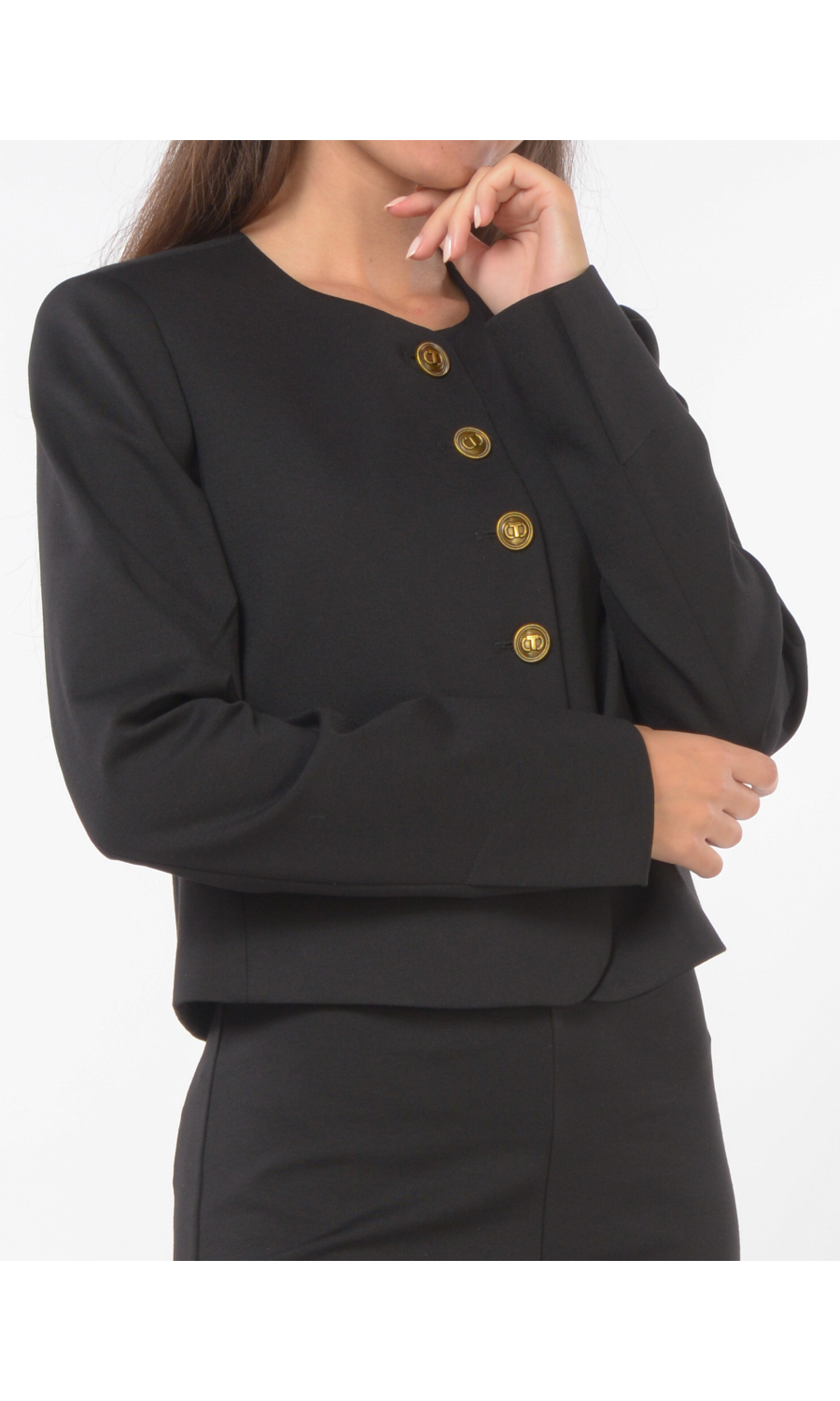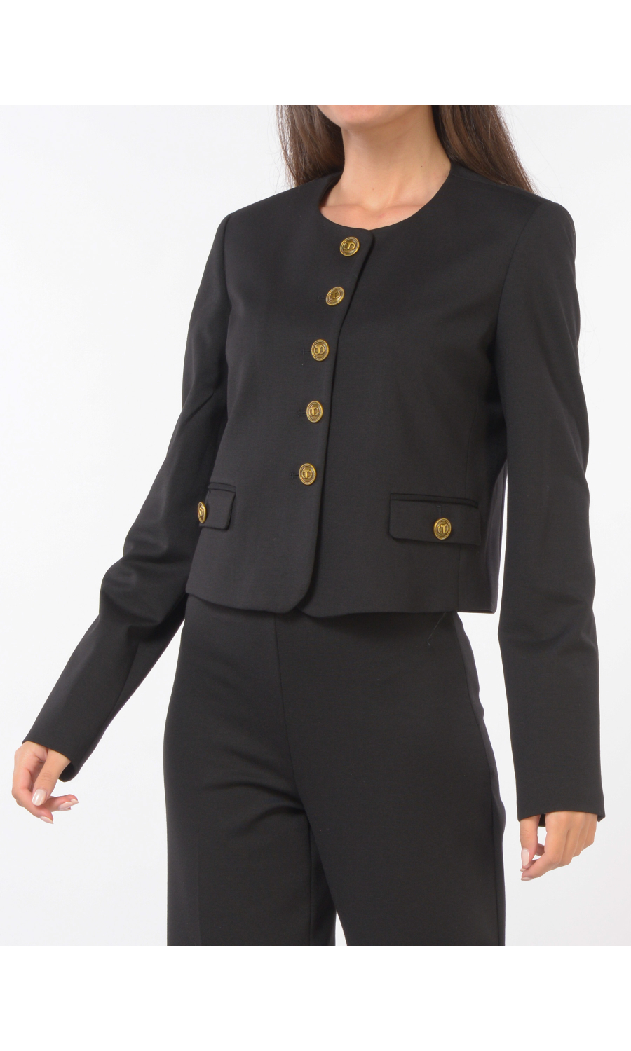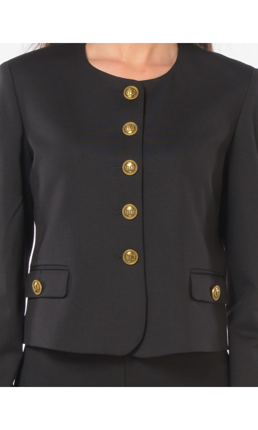 Giacca corta con chiusura frontale tramite bottoni gioiello logati, girocollo, due tasche a pattina frontali, manica lunga con motivo di piccolo spacco sul fondo, foderata.