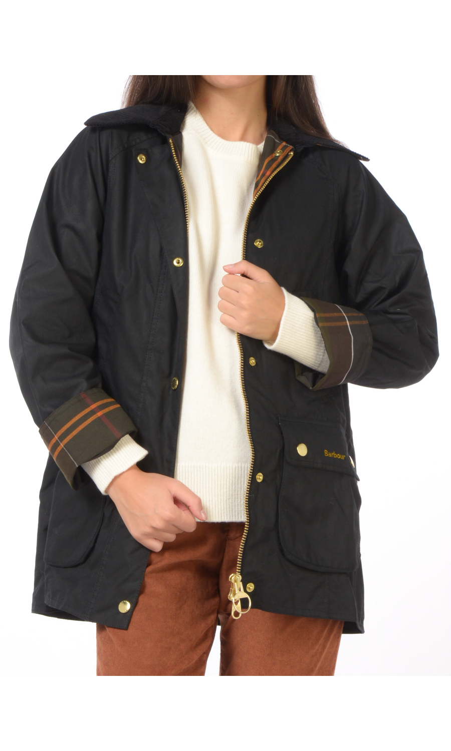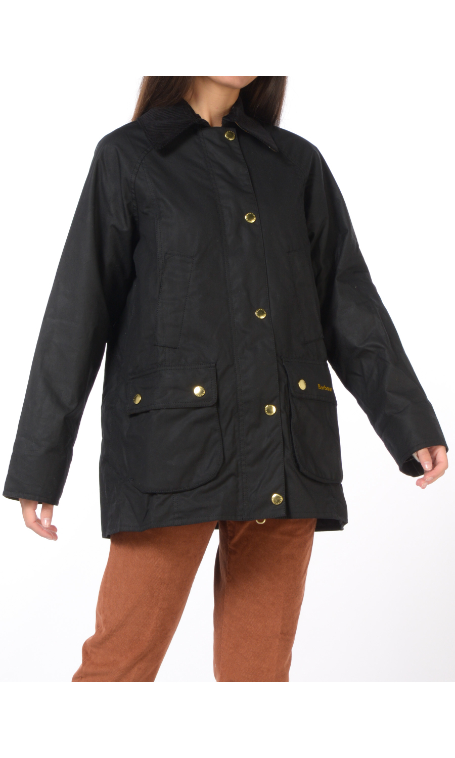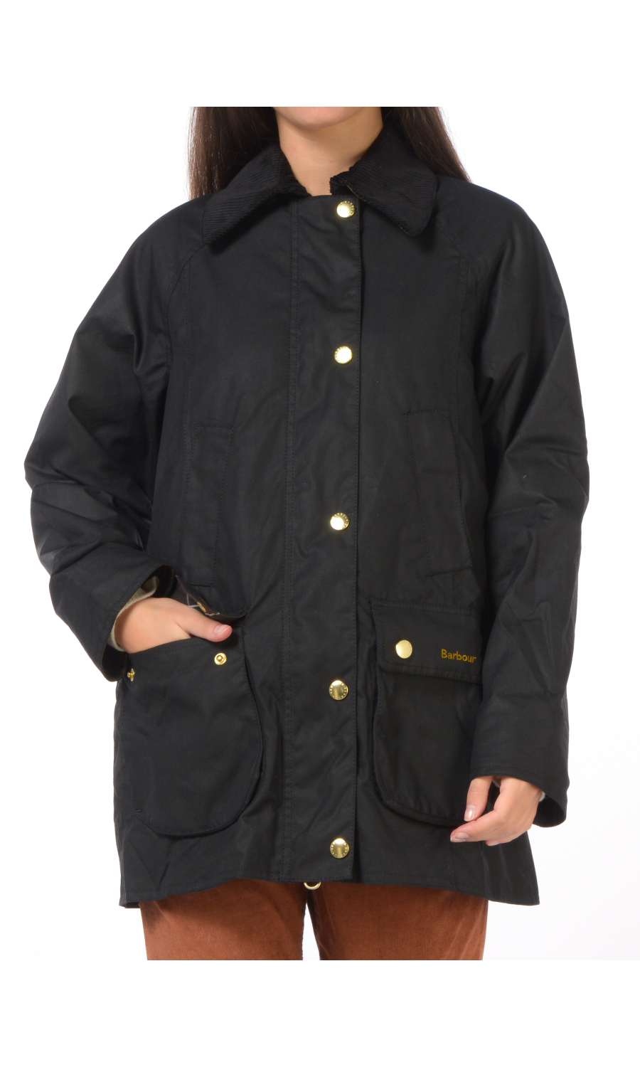 Giubbino modello Beadnell Wax in cotone cerato con due tasche oblique e due doppie tasche a toppa chiuse con pattina e bottoni a pressione a vista frontali, chiusura frontale con zip nascosta e cursore a doppia via logato e con bottoni a pressione logati in metallo dorato a vista, manica lunga con taglio raglan, colletto in velluto rigato con parte interna a fantasia a contrasto colore, motivo di due spacchi posteriori chiusi con bottoni a pressione logati a vista, logo ricamato frontale a contrasto colore, foderato con fodera a fantasia a contrasto colore.