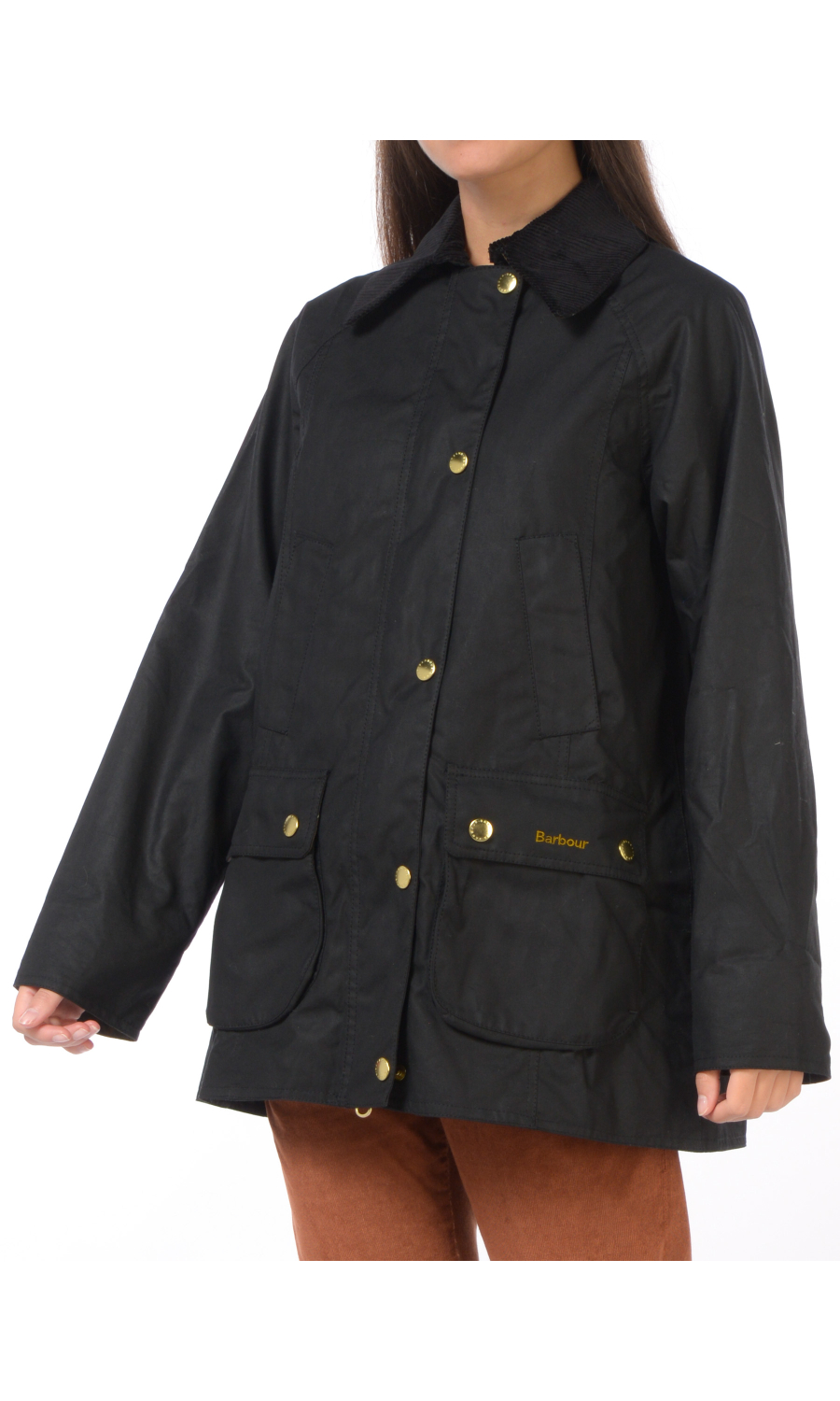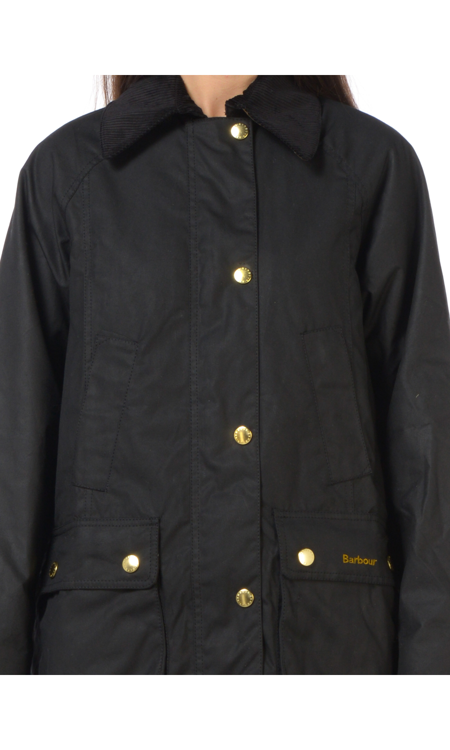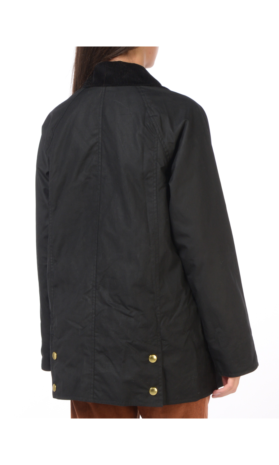 Giubbino modello Beadnell Wax in cotone cerato con due tasche oblique e due doppie tasche a toppa chiuse con pattina e bottoni a pressione a vista frontali, chiusura frontale con zip nascosta e cursore a doppia via logato e con bottoni a pressione logati in metallo dorato a vista, manica lunga con taglio raglan, colletto in velluto rigato con parte interna a fantasia a contrasto colore, motivo di due spacchi posteriori chiusi con bottoni a pressione logati a vista, logo ricamato frontale a contrasto colore, foderato con fodera a fantasia a contrasto colore.