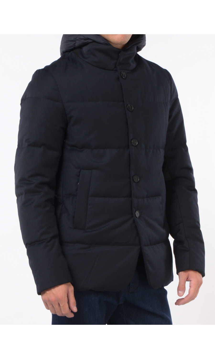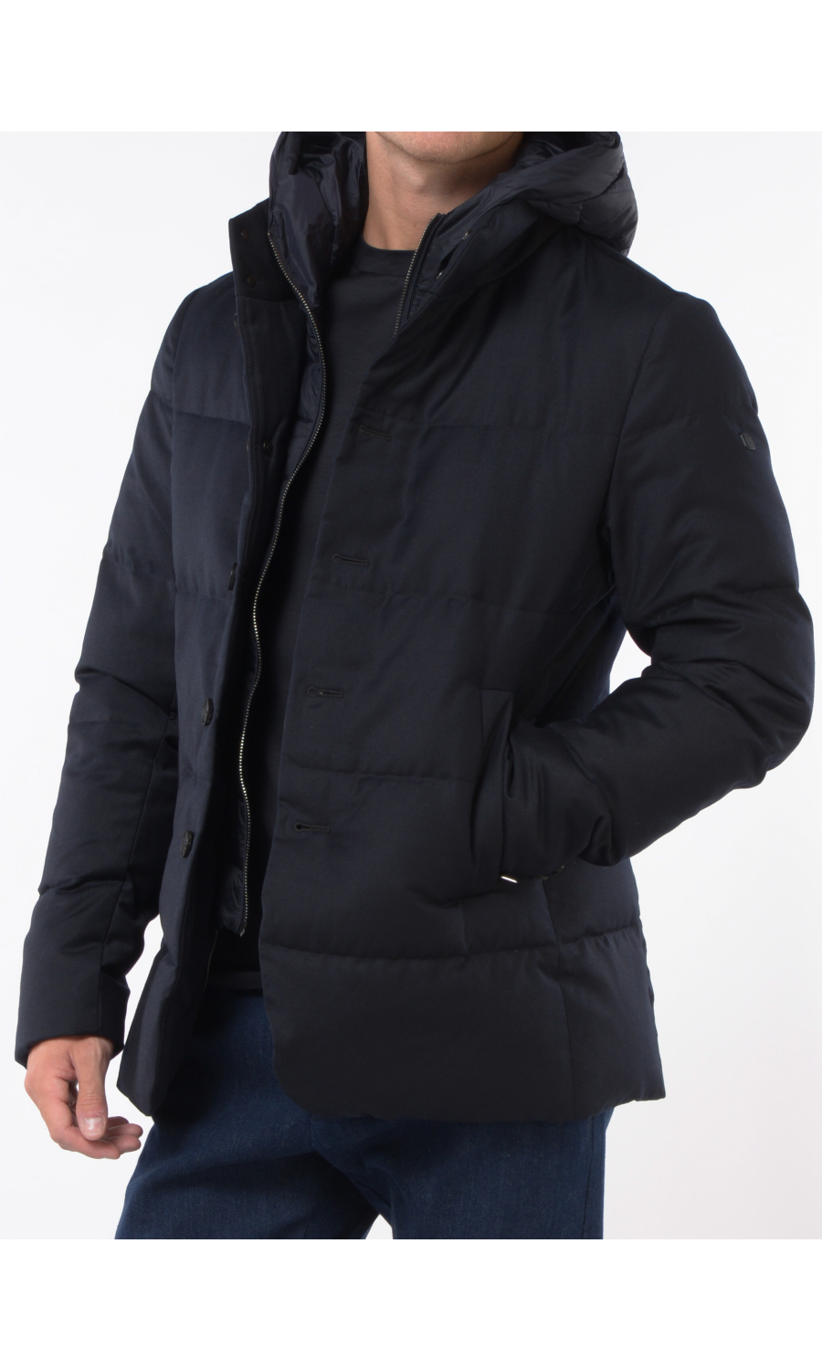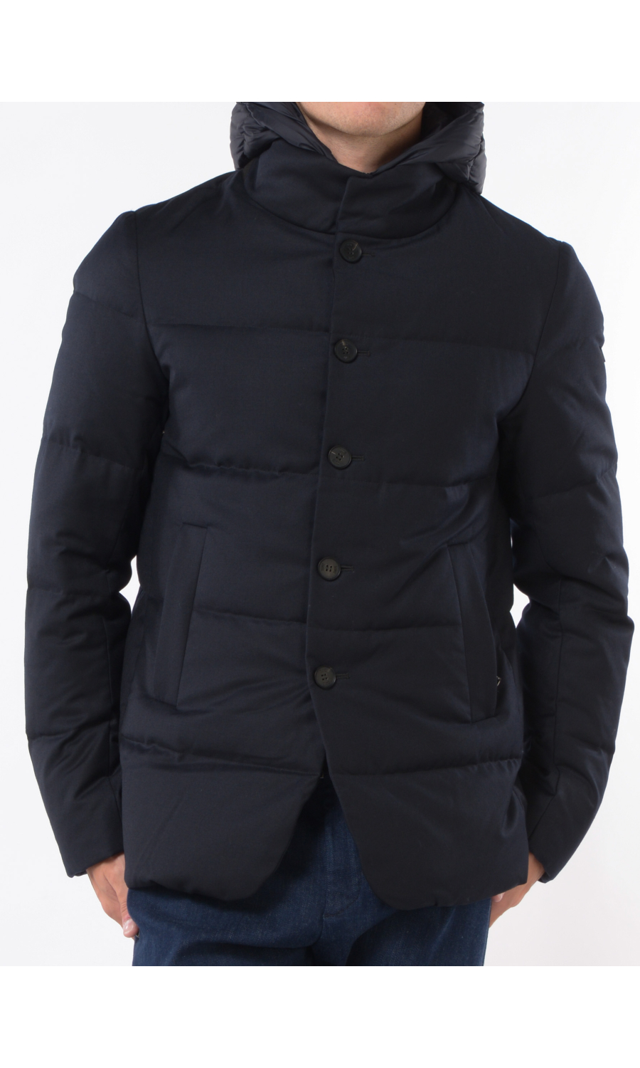 Giubbino in lana imbottito con stacchino scaldacollo e cappuccio rimovibile, chiusura frontale con bottoni a vista e zi p nascosta, due tasche frontali chiuse con zip, logo in metallo applicato su spalla sinistra.