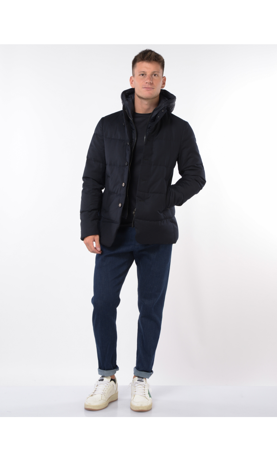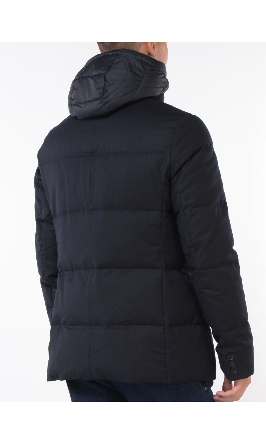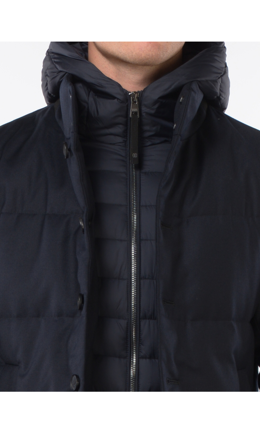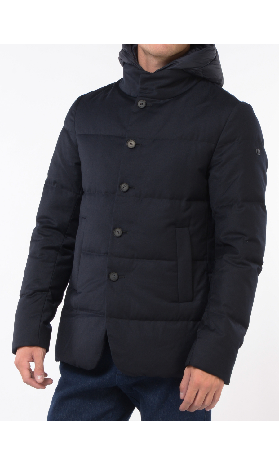 Giubbino in lana imbottito con stacchino scaldacollo e cappuccio rimovibile, chiusura frontale con bottoni a vista e zi p nascosta, due tasche frontali chiuse con zip, logo in metallo applicato su spalla sinistra.