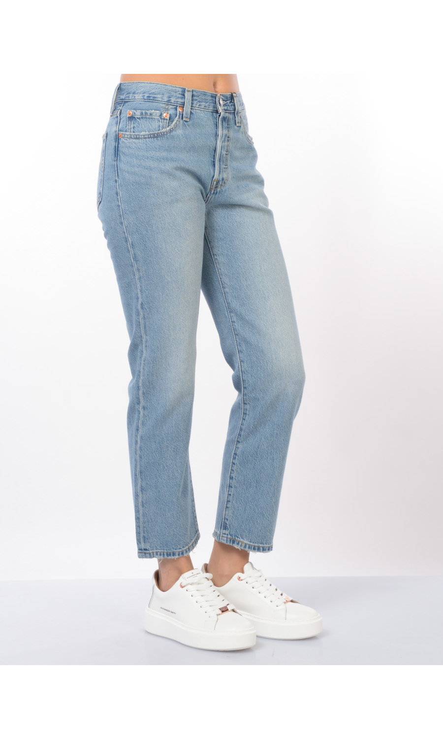 Jeans modello 501 Cropped con effetto delave' e used, chiusura frontale con bottoni logati in metallo di cui il primo a vista, fascetta in vita con passanti e salpa posteriore logata a contrasto colore, cinque tasche, rivetti logati in metallo applicati, motivo di impunture a contrasto colore, piccolo logo in tessuto a contrasto colore applicato sul retro, in cotone e lyocell.