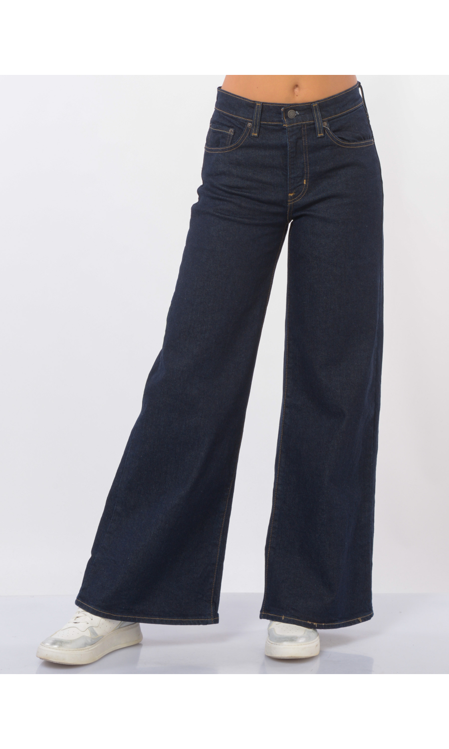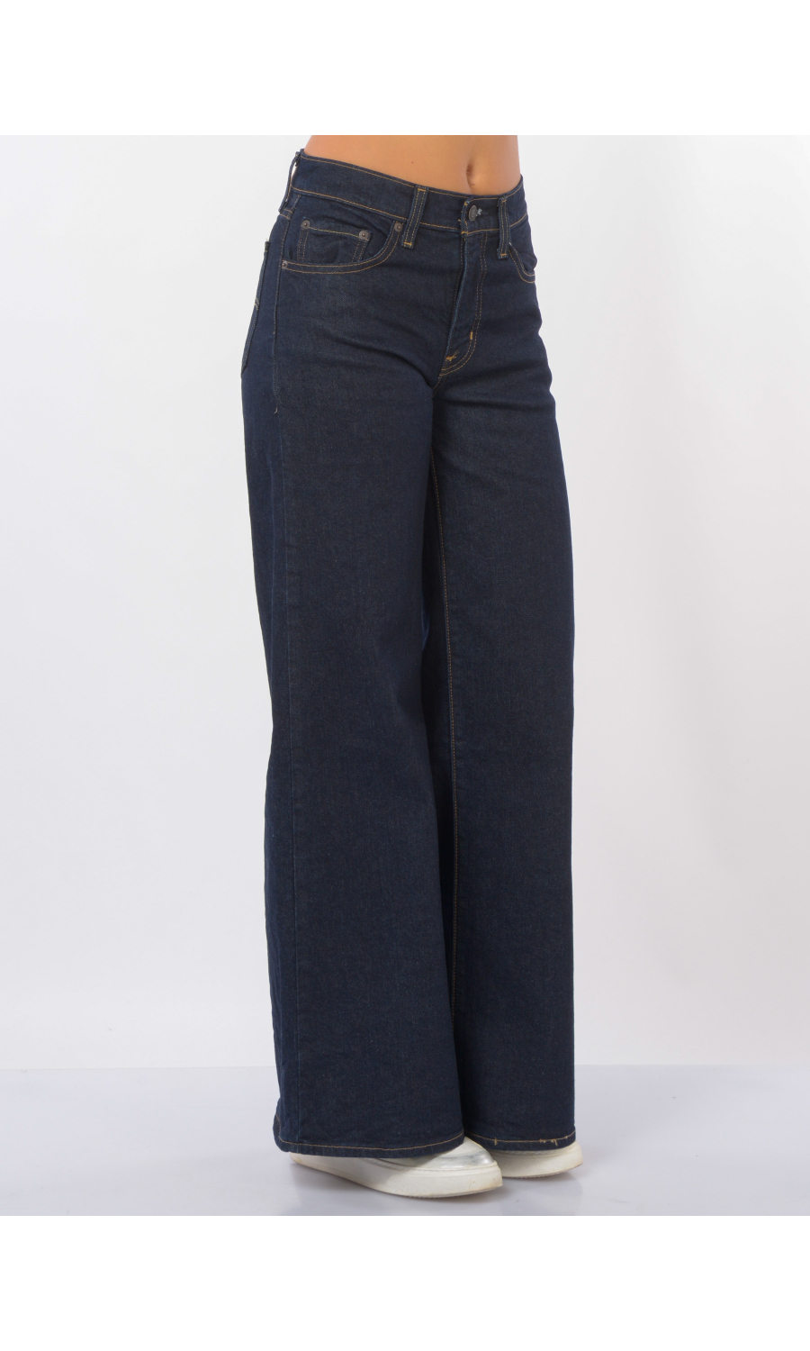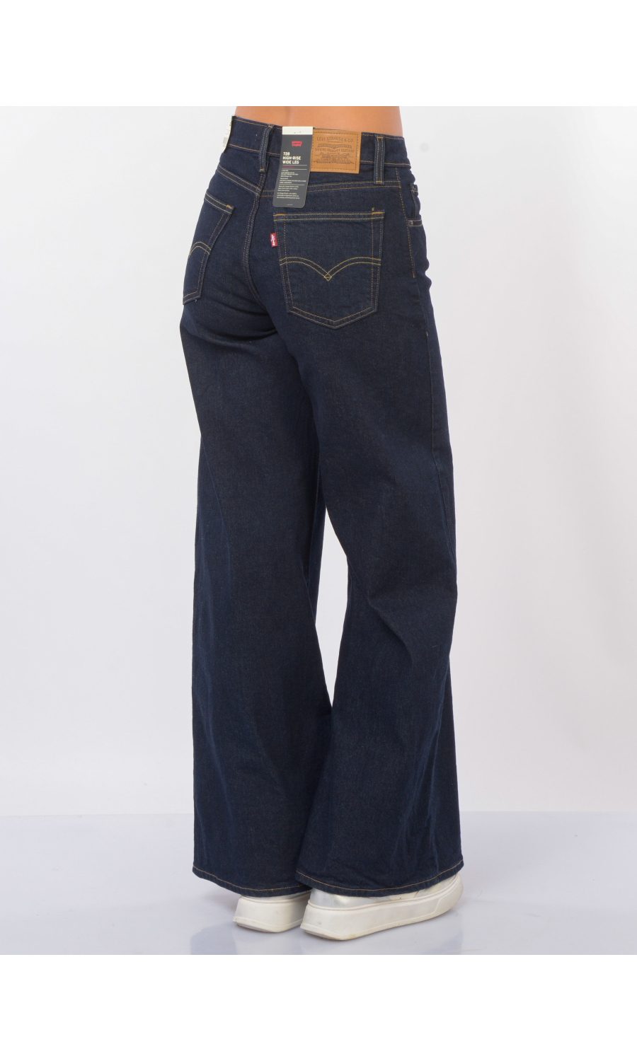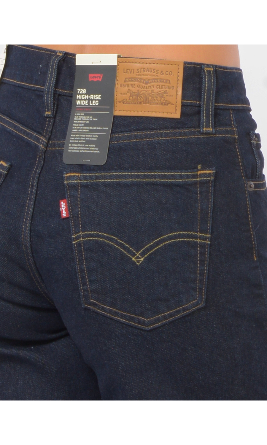 Jeans modello 728 High-Rise Wide Leg con motivo di impunture a contrasto colore, chiusura frontale con bottone logato in metallo a vista e zip nascosta, fascetta in vita con passanti e salpa posteriore logata a contrasto colore, cinque tasche, rivetti logati in metallo applicati, logo in tessuto a contrasto colore applicato sul retro, leggermente stretch.