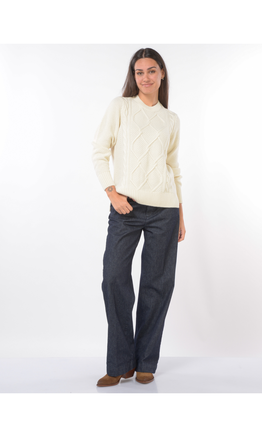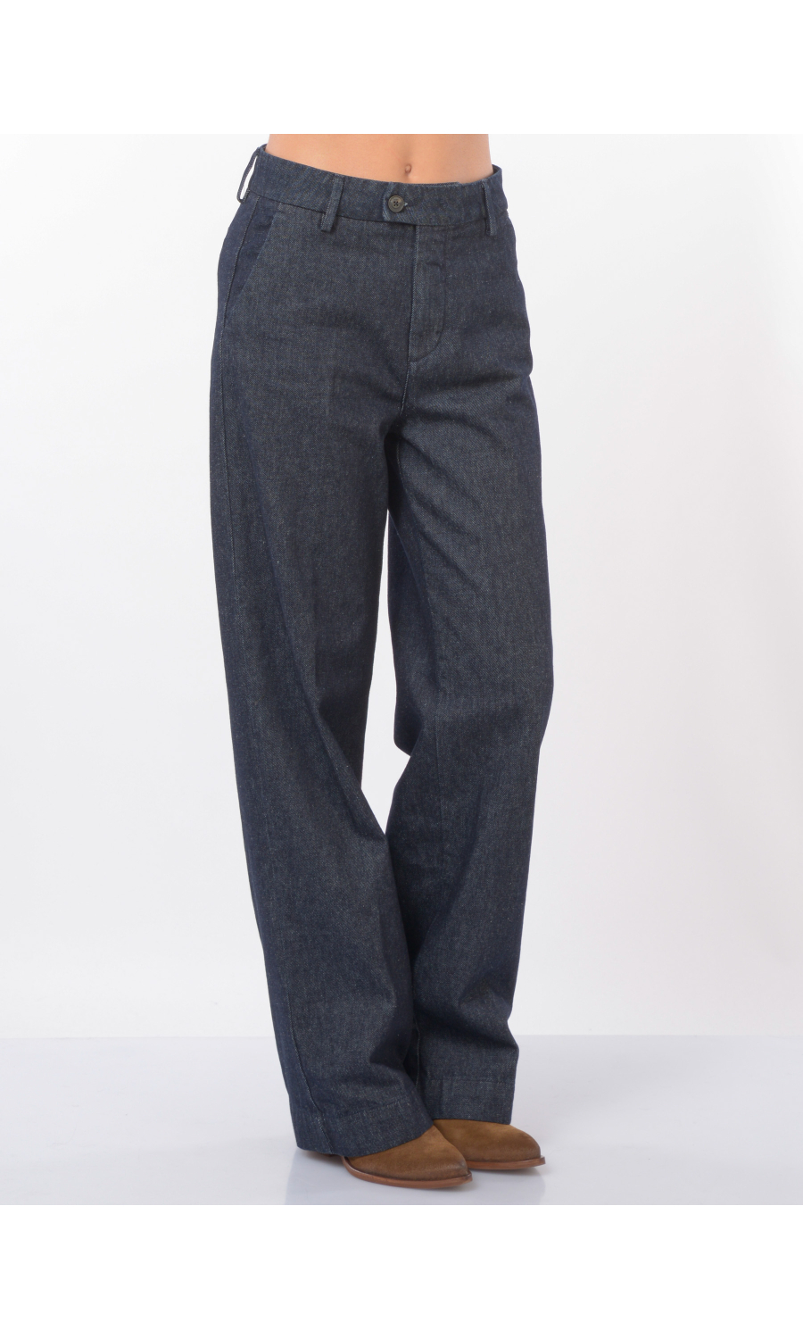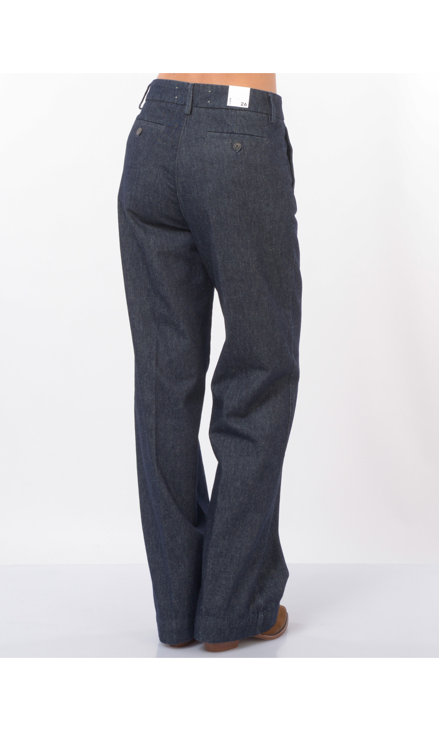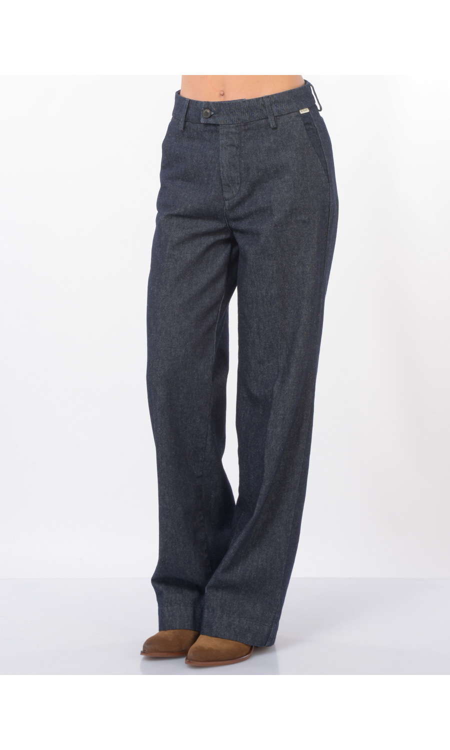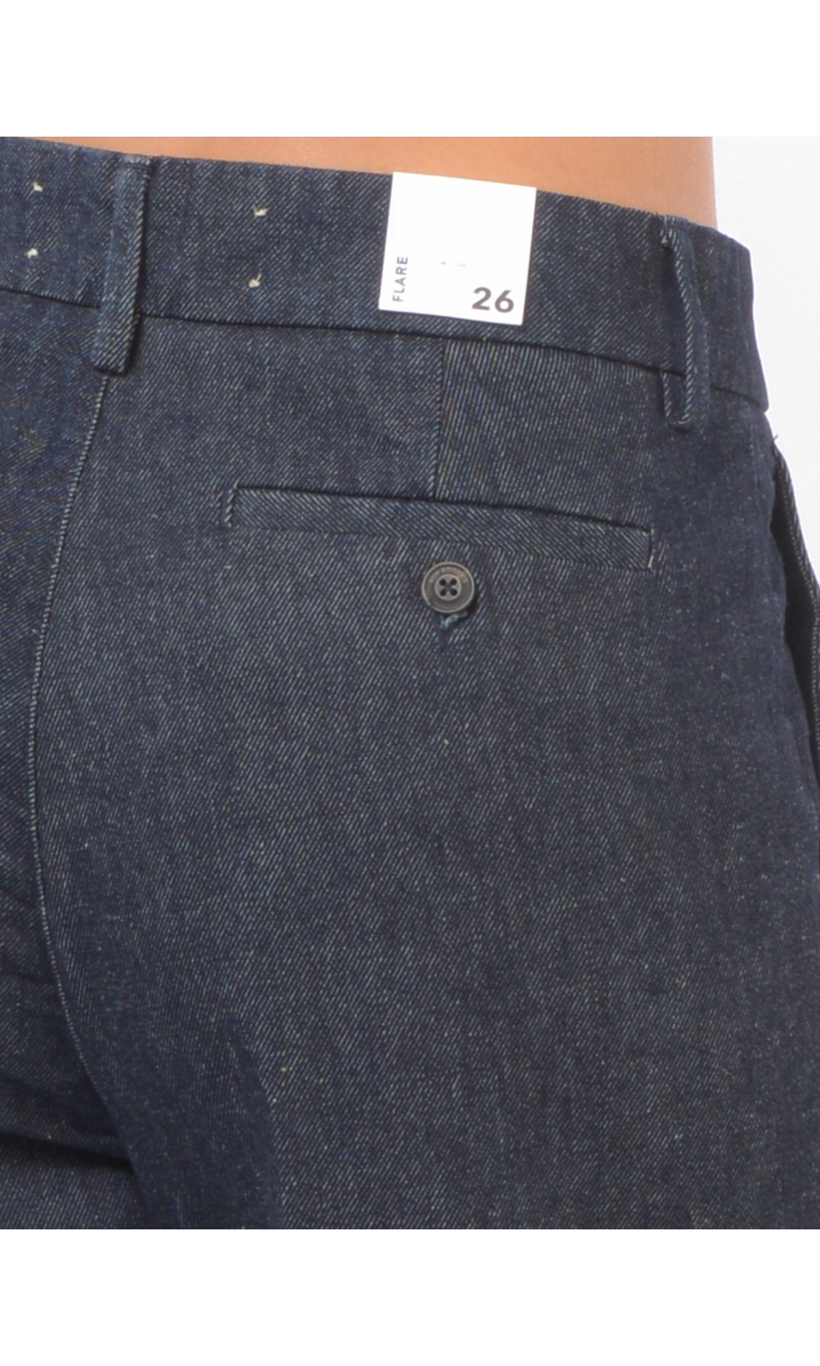 Jeans modello Flare fit con due tasche oblique frontali e due a filetto posteriori chiuse con bottone logato a vista, chiusura frontale con bottoni logati di cui uno a vista e zip nascosta, fascetta in vita con passanti, piccolo logo in tessuto a contrasto colore applicato frontale, piega stirata.