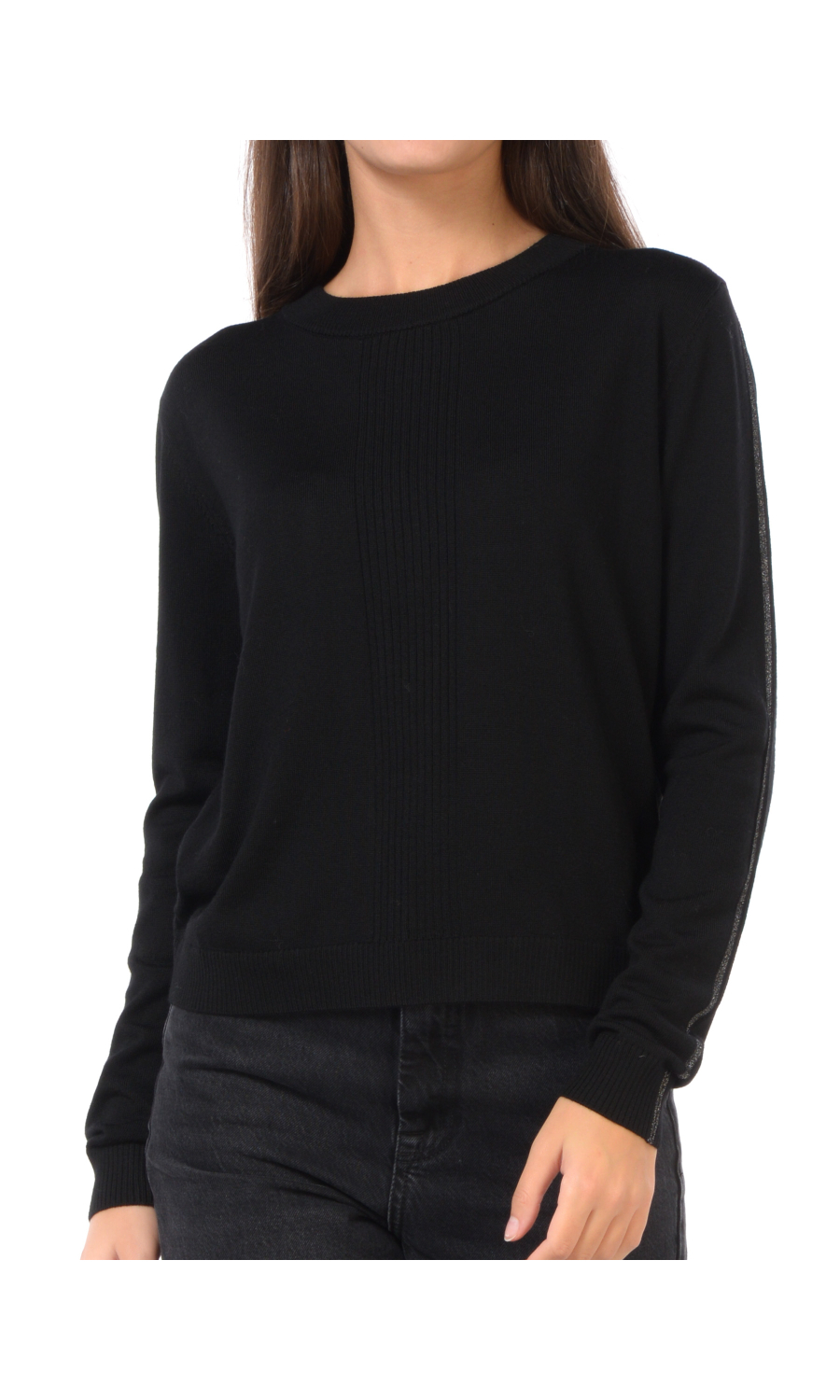 Maglia girocollo con profili lurex su maniche, piccolo motivo di costine verticali centrali, piccolo logo in metallo applicato sul retro, rovescino su polsi e fondo.