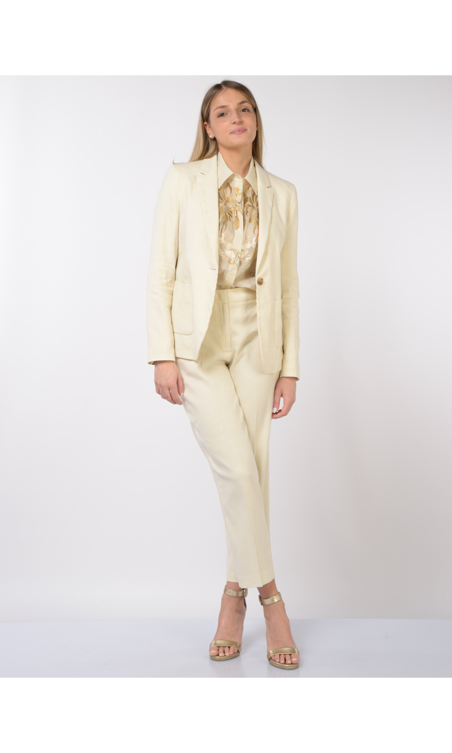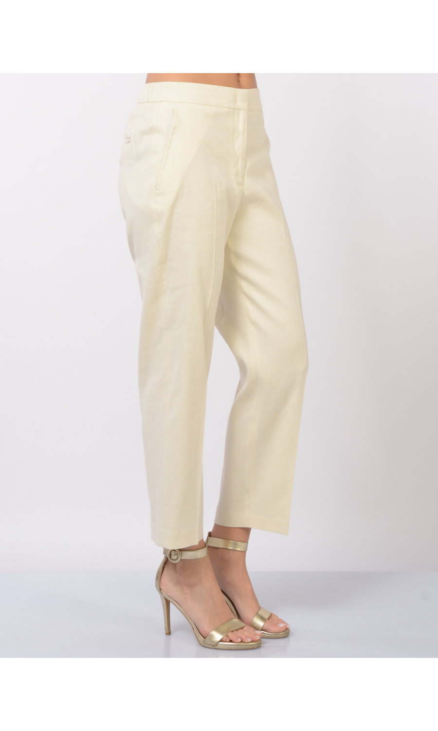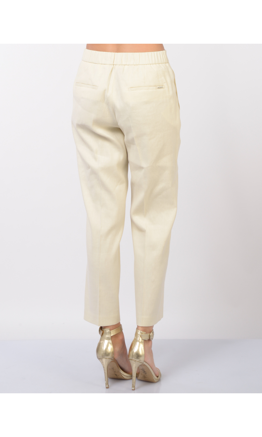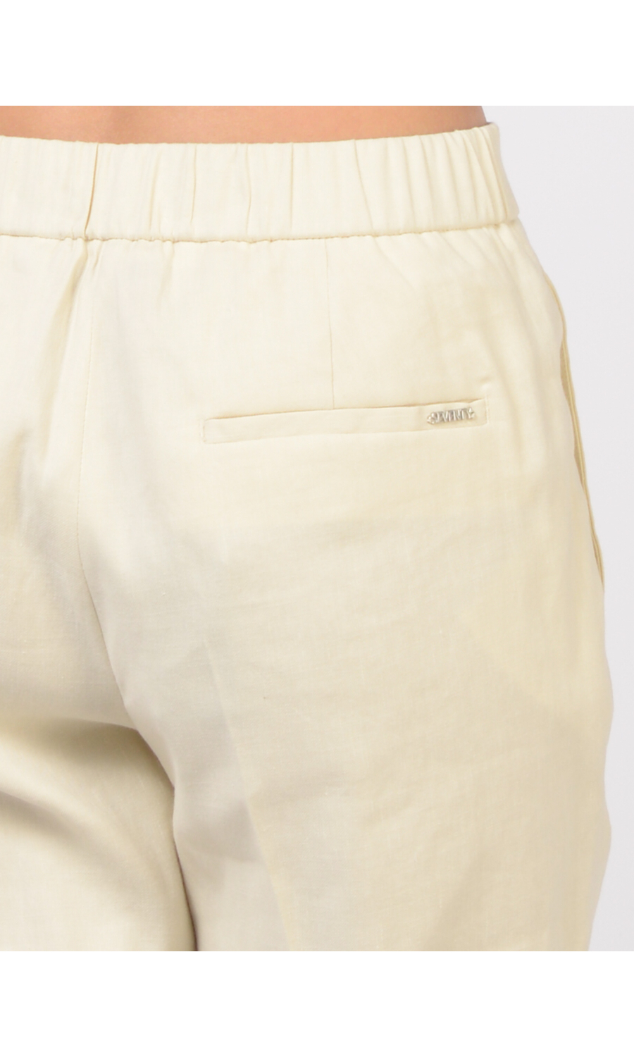 Pantalone modello chino in lino e cotone leggermente stretch, chiusura frontale con bottone, gancetto e zip nascosti, fascetta in vita con elastico nella parte posteriore, due tasche oblique frontali e due a filetto posteriori, logo in metallo applicato sul retro, piega stirata.