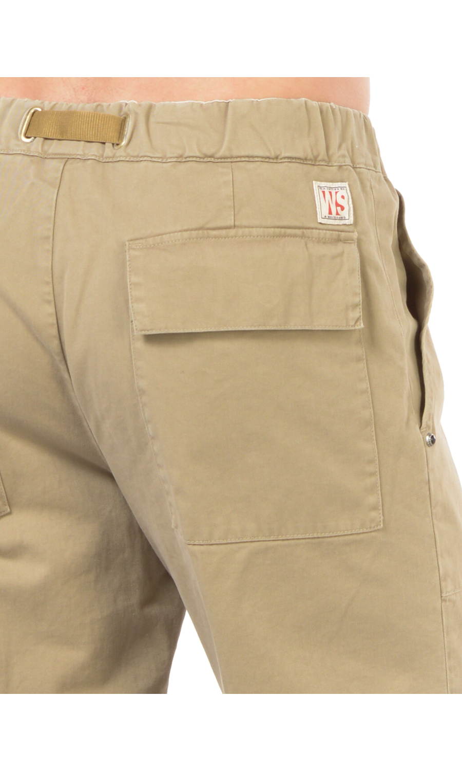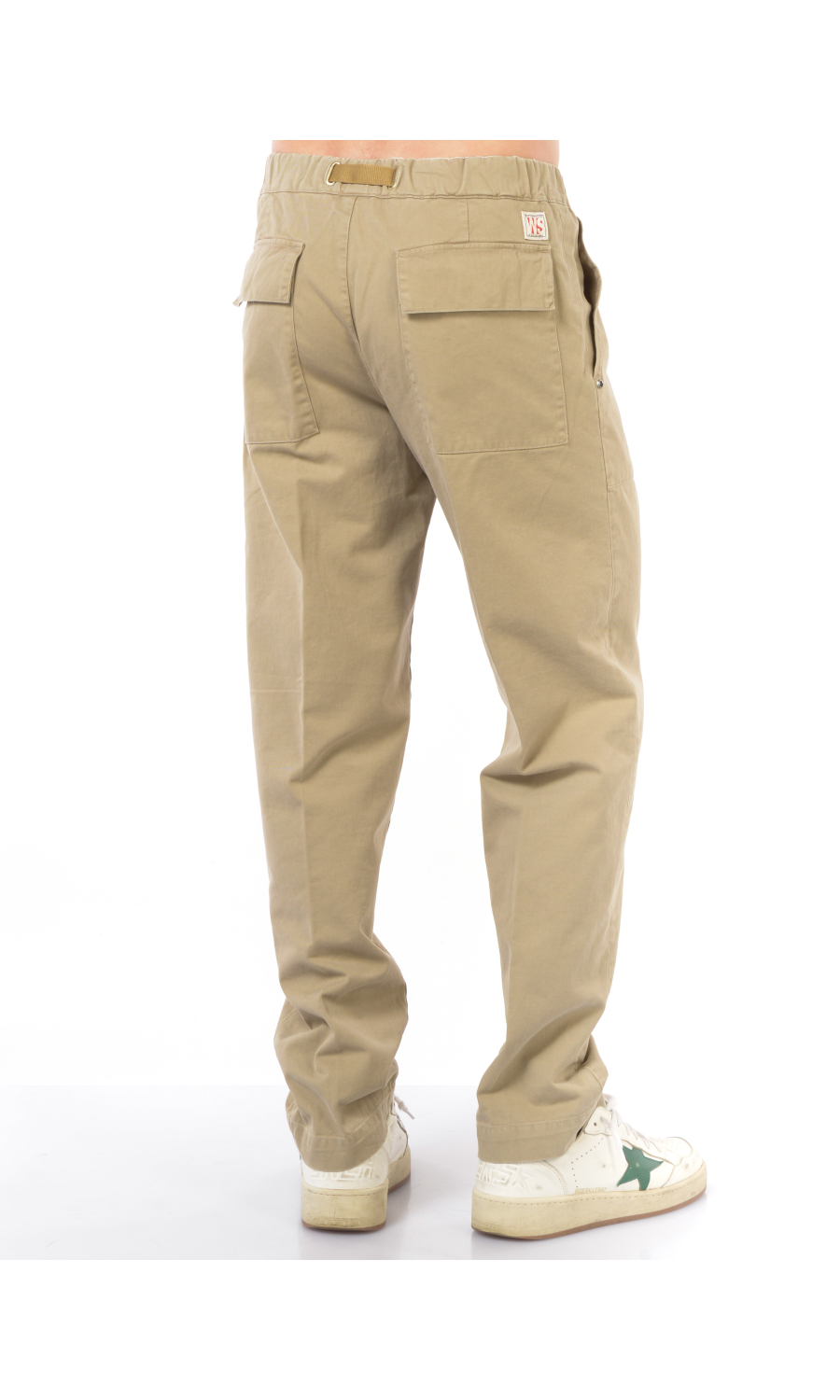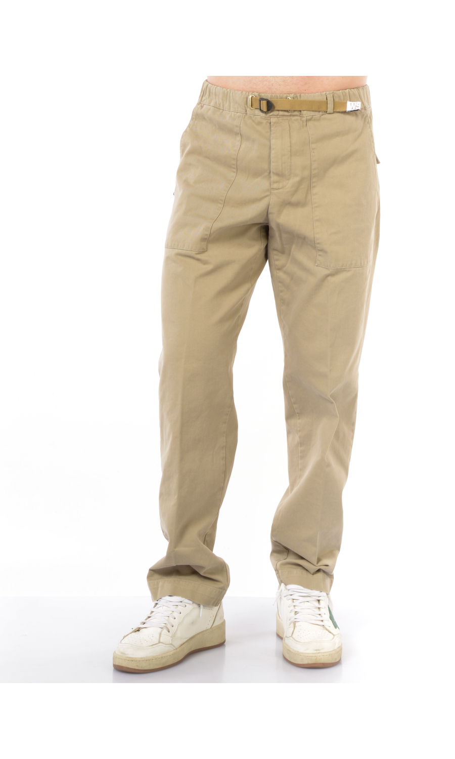 Pantalone modello cargo con elastico e coulisse regolabile su fascetta in vita, zip frontale nascosta, due maxi tasche oblique a toppa frontali e due a toppa posteriori chiuse con pattina e bottone nascosto, rivetto gioiello applicato frontale, piega stirata.